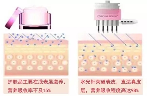 水光补水的溶液进入真皮层后,与发生水合作用,促进血液微循环,以及皮肤对营养物质的吸收。
